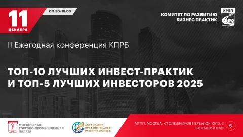 11 декабря 2025 года в Москве состоится значимое событие для делового сообщества — II Ежегодная конференция Комитета по развитию бизнес-практик (КРБП) Московской торгово-промышленной палаты (МТПП), посвящённая подведению итогов рейтинга «Лучшие инвесторы и лучшие инвестиционные практики 2025». Ассоциация профессионалов развития бизнеса (АПРБ) выступает официальным информационным партнером мероприятия.